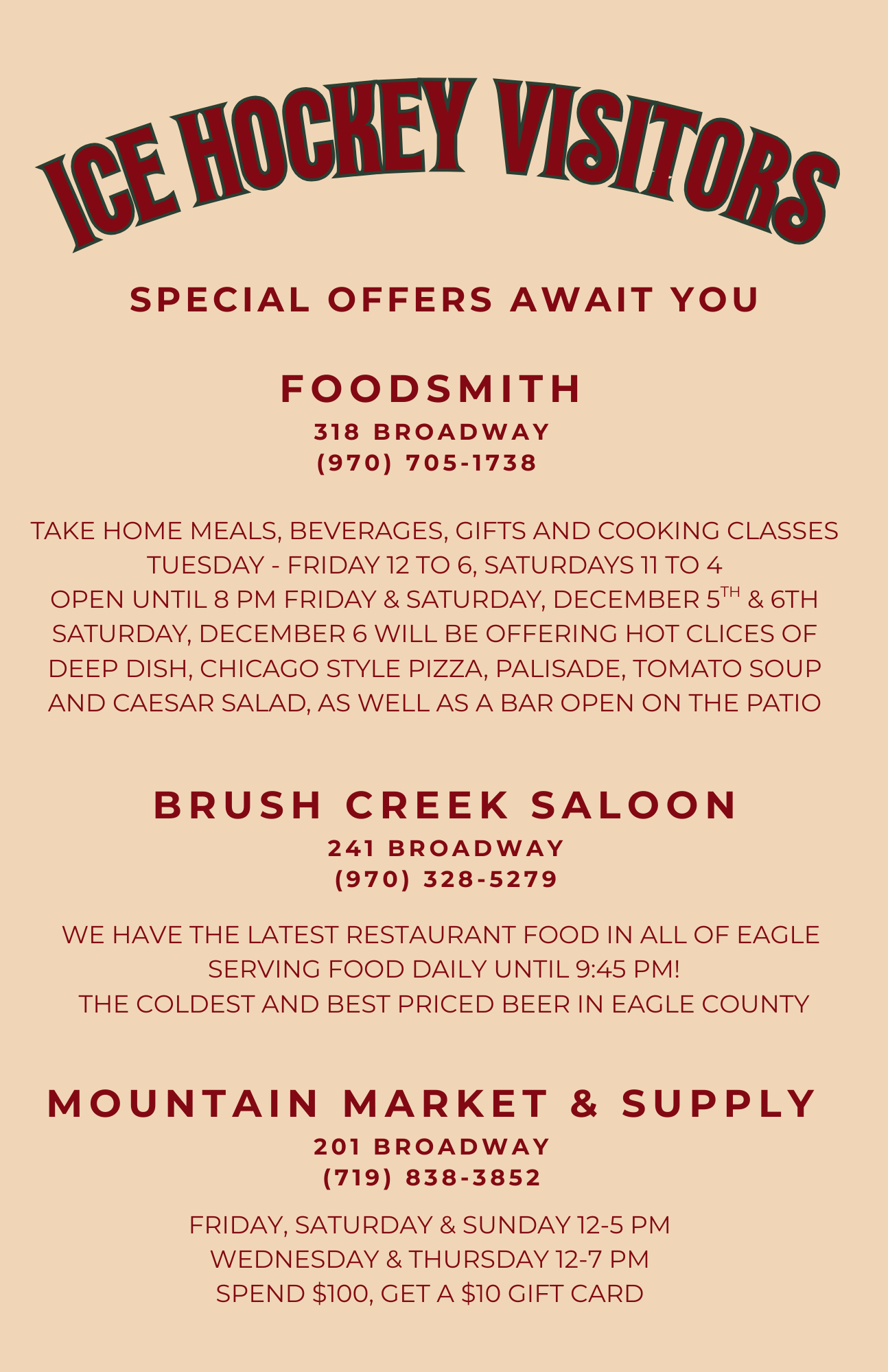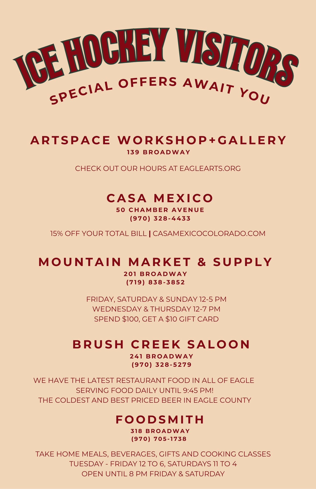 Select Eagle business owners are offering Ice Hockey visitor specials while you are visiting! See some of those offers here.Â